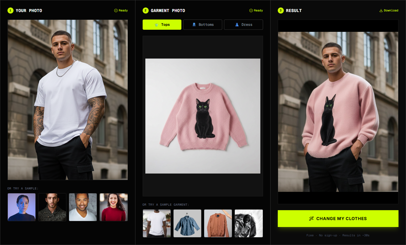 Upload your photo, pick a garment, and let the AI change your clothes in seconds. Free, fast, and incredibly realistic.